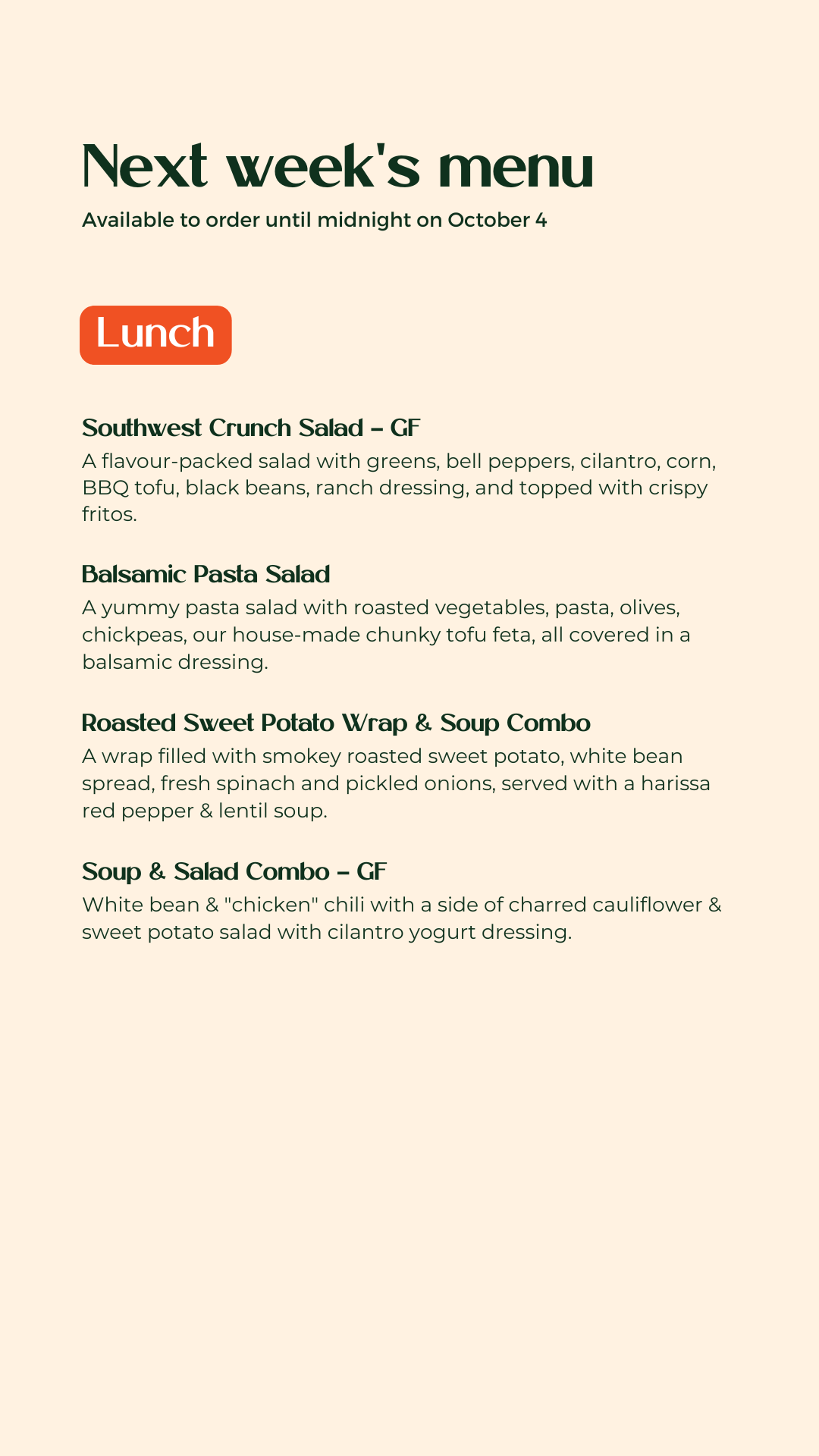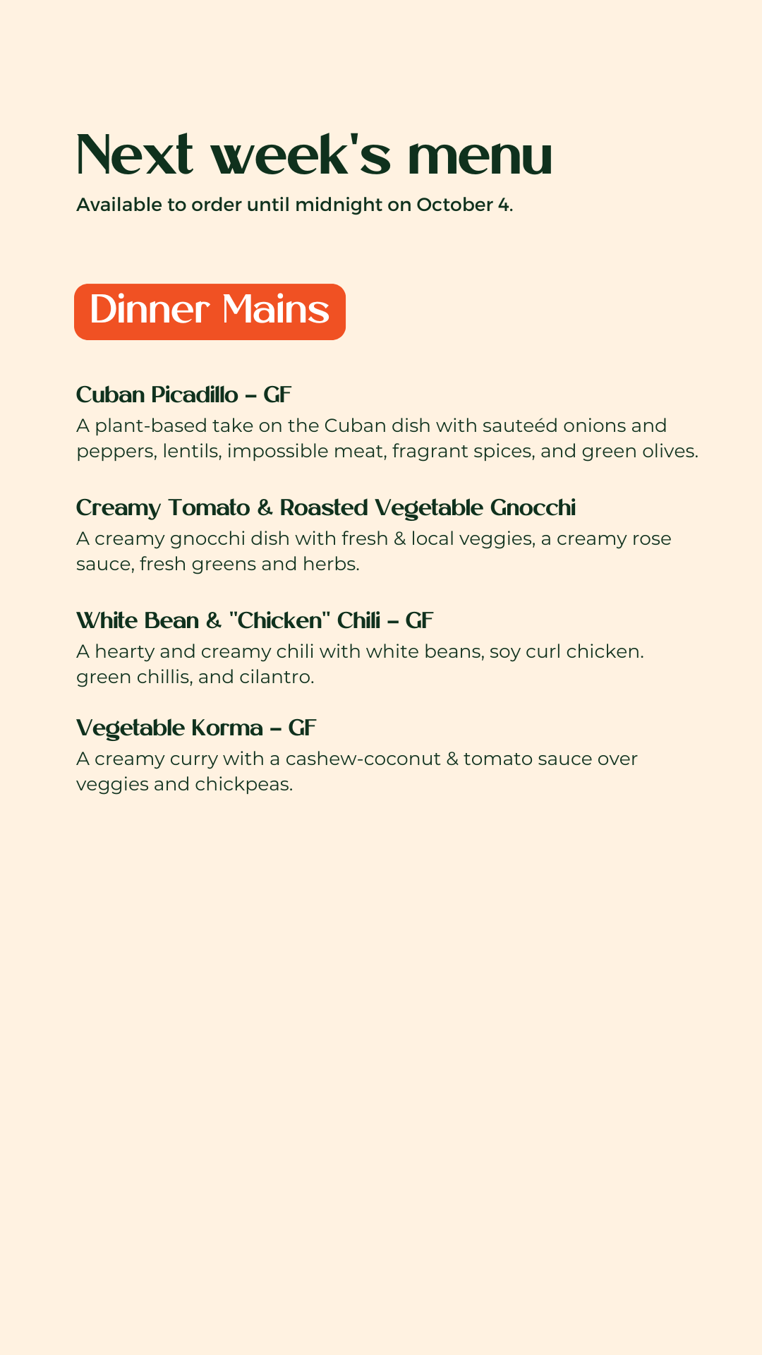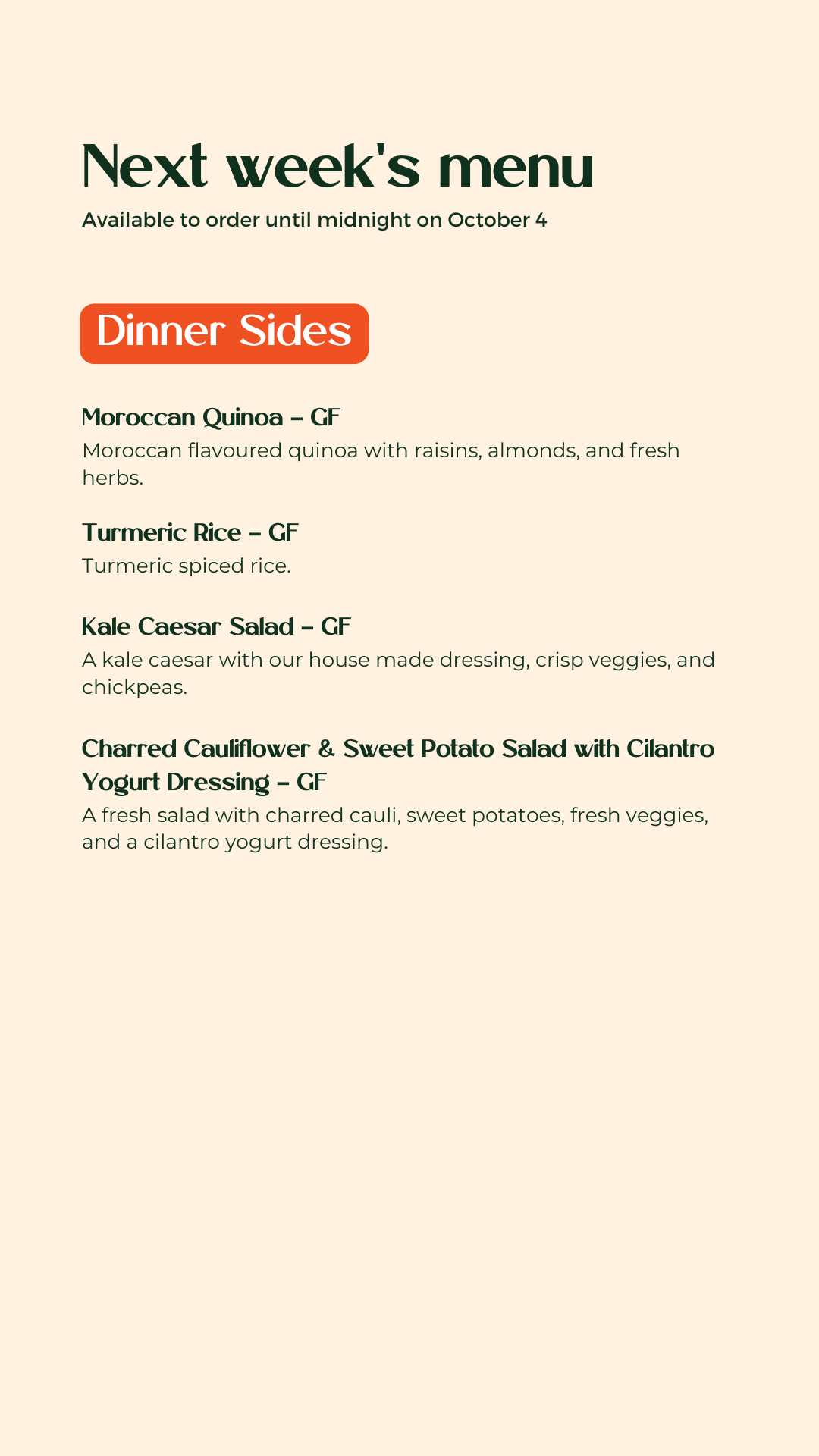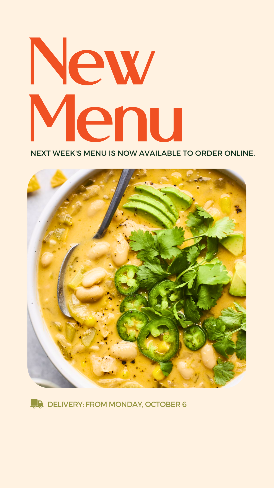 Our menu changes weekly and seasonally. Enjoy 100% real food with no prep time and no cleaning up!